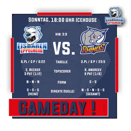 Nach den Rhinos ist vor den Rhinos. Nach der klaren 3:9-Pleite am vergangenen Wochenende steht nun das Rückspiel im Icehouse an. Das Hinspiel hatte ergeben, was die Eisbären erwartet haben. Doch im zweigeteilten Spiel, in dem zunächst die Eisbären dominierten, überzeugten die Rhinos in Hälfte zwei und sicherten sich so Sieg 1.